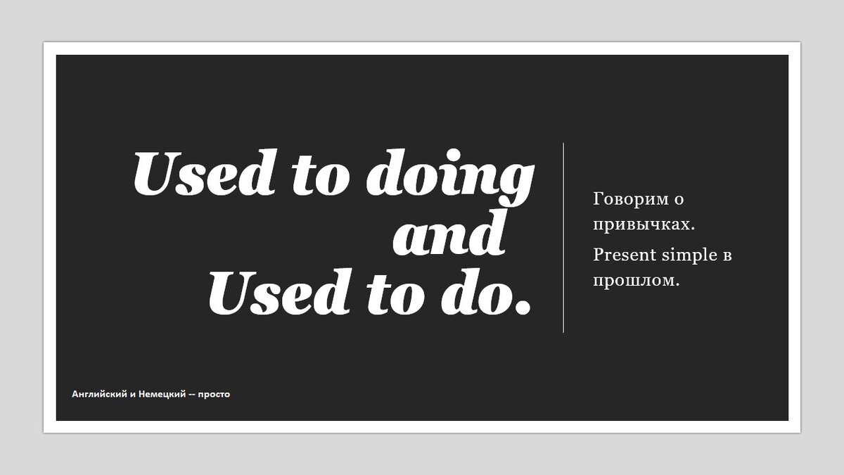 У каждого есть привычки. Они неотъемлемая часть жизни человека ,поэтому каждый серьёзно изучающий английский должен уметь о них что-либо сказать или рассказать. Как многим известно, в английском языке это можно сделать используя конструкцию Used to do ,но лишь немногим известна конструкция Used to doing ,которая тоже важна для правильной английской речи. Used to do Многие люди ,не зная перевода конструкции Used to do, стараются оттолкнуться от перевода слова Use (использовать, пользоваться) ,но с этим значением перевод становится совершенно другим. Used to do переводится в значении "Раньше я что-то делал постоянно". В отличии от времени Past simple ,которое многие хотят использовать вместо Used to do, эта конструкция обладает завершенностью. I cooked yesterday -- Я готовил вчера.(Возможно, буду готовить сегодня ,а может и нет ,но главное ,что я готовил именно вчера.) I used to cook a lot -- До этого я готовил много. ( До этого я готовил много ,но сейчас уже не готовлю.) Used to
