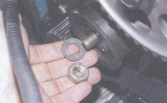 Предварительно снимите ремень привода распредвала. 1.Для замены натяжного ролика отверните гайку его крепления, снимите шайбу, а затем и натяжной ролик со шпильки. 2. Под натяжным роликом установлено дистанционное кольцо.