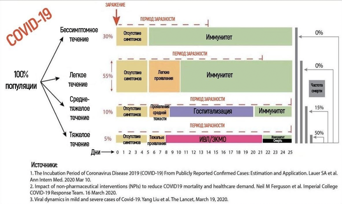 Вопрос, который волнует сейчас многих, какое время человек остается заразным после положительного теста на коронавирус. На приведенном выше графике прекрасно показано, что все зависит от течения болезни. Бессимптомное течение - это когда тест сдал человек, который контактировал с больным коронавирусом или просто решил провериться, при отсутствии у него симптомов, и тест оказался положительным. В таком случае мы наблюдаем самый короткий, если это так можно назвать, период заразности - 14 дней. При легком течении человек может быть заразным в течение 3-х недель - 21 дня. Заразность при средне-тяжелом и тяжелом течении практически на весь период болезни, сколько бы он не длился. Период тяжелого течения может достигать до 2-х месяцев. ВОЗ рекомендует самоизолироваться на 14 дней даже после исчезновения симптомов после перенесенного коронавируса, поскольку пока точно неизвестно, насколько долго переболевший человек может оставаться заразными. Не стоит забывать, что период с момента за