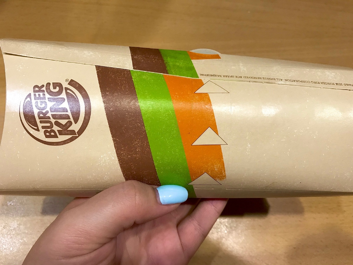 Из всего меню заведений быстрого питания, я выбрала для себя продукт, который подходит мне по нескольким параметрам: Это цезарь рол от Burger King. Посмотрите как удобно открывается упаковка. Круто, что можно не есть руками. В этом главное отличие от обычных бургеров. Для меня в нем все идеально. По сути овощи, курица, сыр и соус. Очень вкусное и сбалансированное сочетание. У бургеров аж две большие булки и получается как то сухо на вкус. Здесь же вместо булки тонкая и нежная лепёшка. И ты ощущаешь уже не сухость во рту, а весь полный вкус наполнения рола. Посмотрите на БЖУ, углеводов и белков почти поровну, жиров мало. В бургере, например, из-за булок, углеводов в 2 раза больше. А из-за обжарки котлет в масле, много жиров. По итогу, для меня цезарь рол просто находка – вкусный приём пищи, насыщений белками и клетчаткой. Я считаю это очень даже полезным.