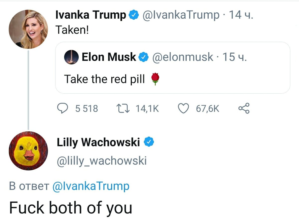 Вчера бизнесмен запостил твит «Выберите красную таблетку», впоследствии его ретвитнула Иванка Трамп, что вызвало недовольство со стороны соавтора ленты 1999-го года.