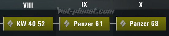 KW 40/52. СТ 8 уровня Аванпроект на основе танка KW 30 52. Исторически машина представляет собой улучшенную версию оригинального KW 30. Особенностью было усиление брони: в башне до 170 мм, а корпус имел 110-120 мм во лбу и 60-75 мм в бортах. В качестве основного вооружения может быть ствол от первых прототипов Panzer 58. Это тоже 90 мм, но с улучшенными параметрами. В стоке, скорее всего, будет ствол от 7-го уровня, с заточенными под 8-й уровень ТХ. Подвижность на уровне, скорее тяжелого, нежели среднего танка. Максимальная скорость 35-40 км/ч и не более. В открытых источниках самый мощный двигатель для этого танка имел 800 л.с. Panzer 61. СТ 9 уровня При создании машины были учтены все проблемы и недостатки Panzer 58. В кач