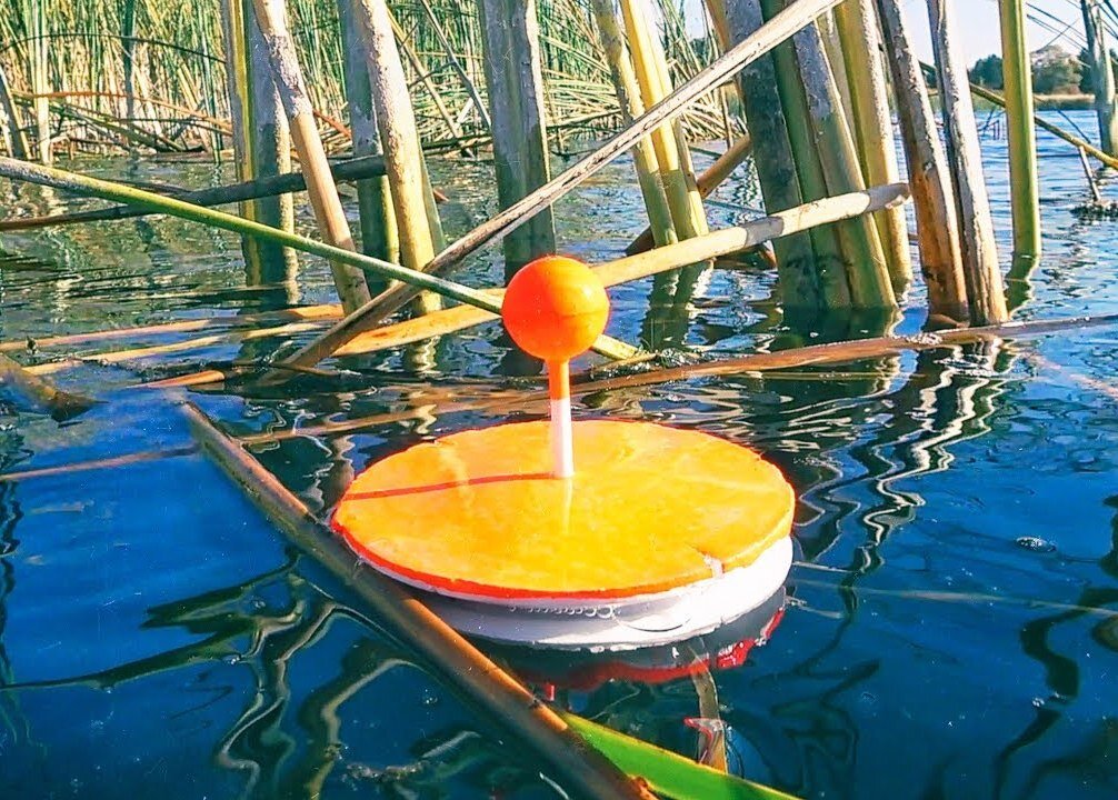 Этот вариант снасти имеет простую конструкцию. По своему внешнему виду он похож на предмет в виде диска, изготовленный из не тонущего в воде материала. По его окружности наматывается леска, а в центре имеется штырь. Он необходим в качестве рычага, для захвата схватившей живца хищницы. Материалом изготовления диска служит древесина или пенополистирол, диаметром около 25 см. Толщина его редко превышает 3 см. для лучшей видимости его поверхность окрашивают в две зоны разных оттенков – обычно это ярко-красный цвет в верхней части и белый снизу.