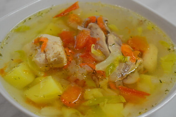 Вкусный, легкий, ароматный супчик. ----- Нам понадобится: ----- Для этого супа можно взять бедрышки, голени или любые части курицы по желанию. Я взяла половину целой курицы, нарезала на небольшие части. Количество ингредиентов указано на четырехлитровую кастрюлю. В кастрюле вскипятить воду, положить курицу, варить сорок минут на небольшом огне. Капусту мелко нарезать, добавить в кастрюлю,варить две минуты. Лук мелко нарезать, добавить в кастрюлю, варить две минуты. Морковь натереть на крупной терке (или мелко нарезать), добавить в кастрюлю, варить две минуты. Картофель нарезать небольшими кубиками, добавить в кастрюлю. Суп посолить и поперчить по вкусу. Варить пять минут. Помидоры нарезать небольшими кубиками, добавить в кастрюлю. Варить пять минут. Супчик выглядит очень красочно и позитивно :) При желании можно посыпать сушеной или свежей зеленью. Убрать с огня. Дать настояться десять минут. Приятного аппетита!