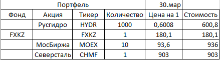 Продолжаю добиваться целей указанных ранее (ссылка ну прошлую статью), а именно добиться дохода в 100 рублей в месяц, за счет дивидендных выплат. 30 марта 2020г. Пополнение еще на 1836 рублей. Покупаю следующие ценные бумаги: Почему МосБиржа? Она управляет площадкой по торговле ценными бумагами в России, а в связи с последними событиями многие обзавелись брокерскими счетами, и конечно она выплачивает дивиденды в размере 6,23% . Поэтому я думаю, что она пойдет наверх. Теперь Северсталь, хочу что-то из сектора "Металлы и добыча", и к тому же выплачивает большие дивиденды, а это 12,49%. Но она крайне волатильная, можно было и подешевле взять. По итогу мой портфель выглядит так: Также буду стараться диверсифицировать портфель. Кто не знает, это значит, что портфель должен содержать не менее 10 акции, где каждая акция занимает не более 15%. Это необходимо чтобы снизить волатильность портфеля. И такие денюшки я получаю сейчас: Также я ищу