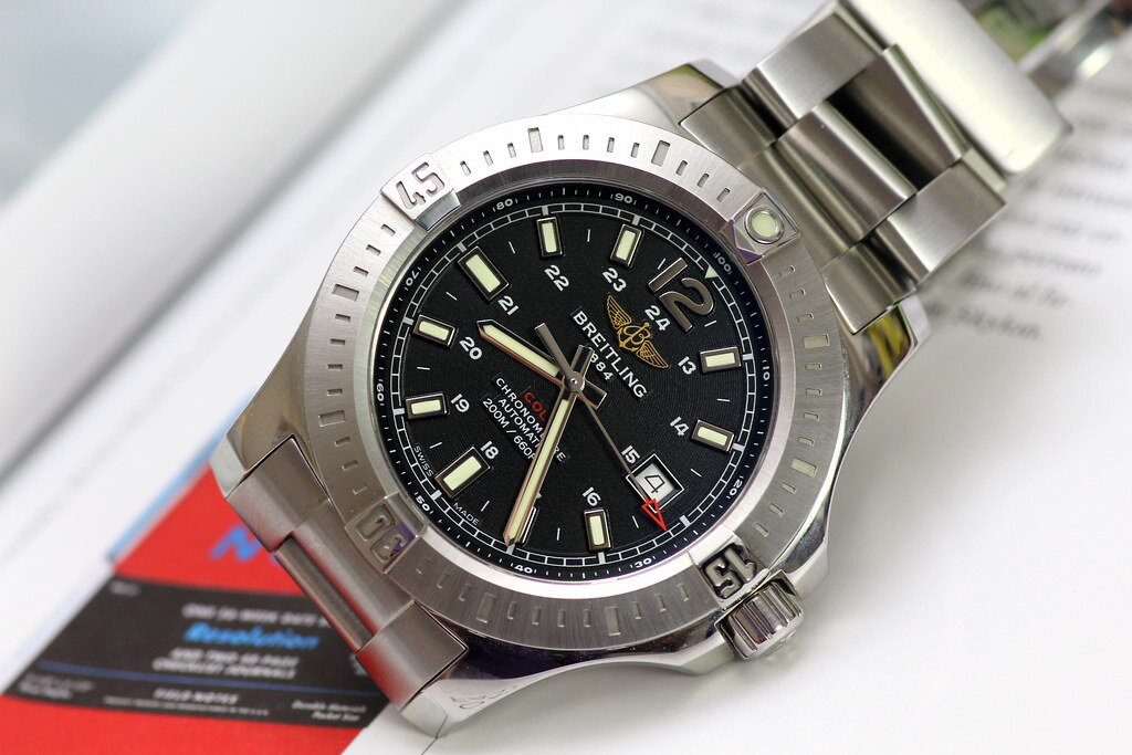 Breitling Colt История бренда Breitling началась в 1884 году, когда ее основатель Леон Брайтлинг открыл часовую мастерскую в Сент-Имье. Имя Breitling неразрывно связано с миром авиации. С миром, о котором некоторые мечтают, а для некоторых этот мир - обыденность. Лучше непосредственно перейти к самим часам. Думаю, там есть на что посмотреть. Ни для кого не секрет то, что Breitling широко использует механизмы производства ЕТА. Естественно, эти калибры должным образом дорабатываются, тестируются, настраиваются, получая сертификаты хронометра и новое название. В этом плане Colt не стал исключением. Широко известный и применяемый многими часовыми производителями ETA 2824-2 послужил базовым калибром для Breitling B17. Этот механизм (В17), в свою очередь, нашел применение во многих моделях различных линеек Breitling. Надпись Hronometre на циферблате влечет за собой повышенные требования. предъявляемые к точности механизма. С этими параметрами у рассматриваемый модели Colt полнейший поря