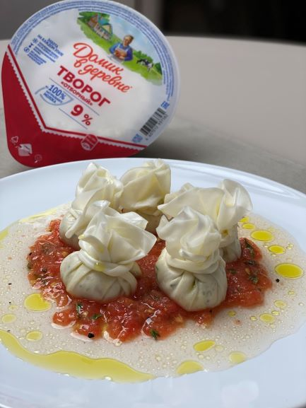 В глубокую тарелку выложить томатное пюре и на него уложить сырные хинкали.