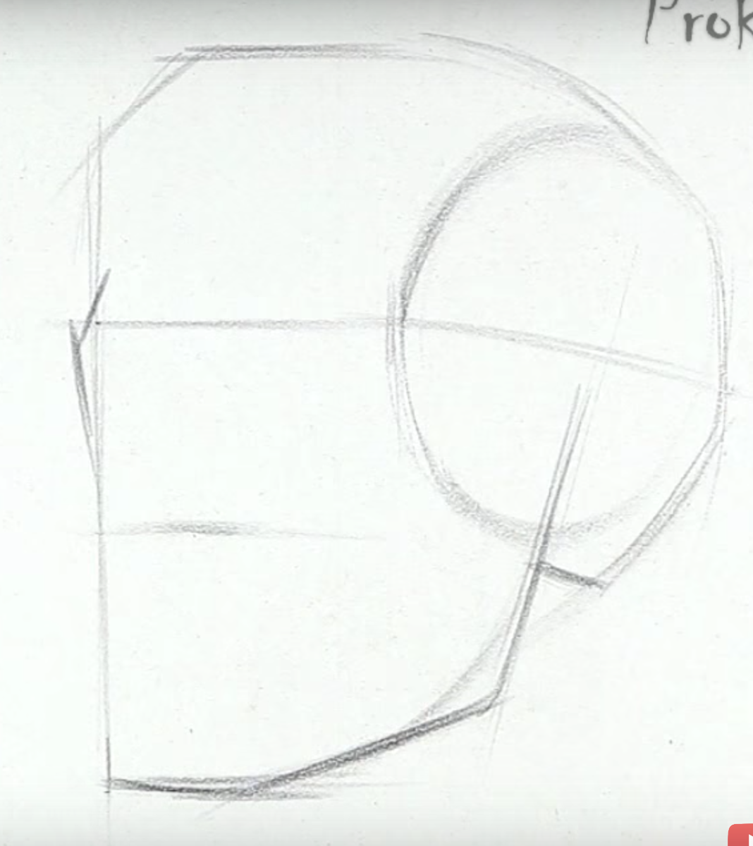 Этап 1 Начните свой рисунок с наброска. Очертите силуэт головы в развороте ¾. Обрисуйте полукруг, затем пририсуйте очертания нижней челюсти и выделите височную долю. Лицевую часть разделите двумя горизонтальными линиями. Этап 2