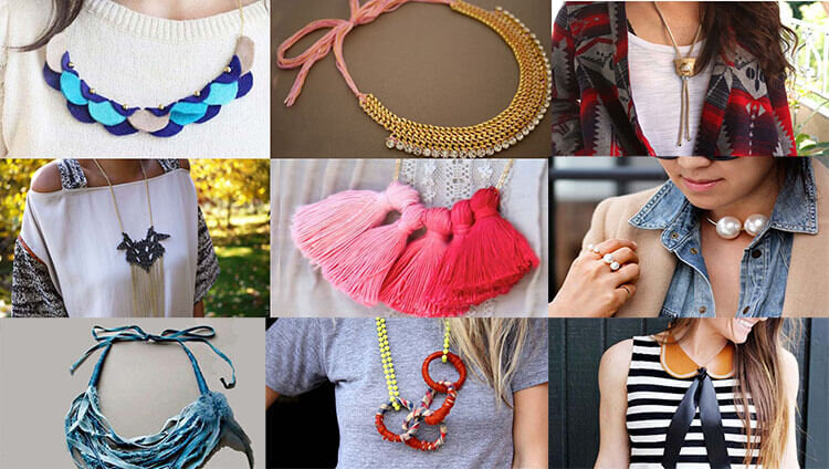 Как сделать ожерелье? Предлагаю попробовать идеи с новыми комбинациями лент, цепочек, нитей для вышивания и разнообразных безделушек. Наша фото-галерея тщательно продумана и наполнена сезонным блеском! Украшения просты в изготовлении и не требуют каких-либо специальных ювелирных инструментов. Убедитесь сами на сколько легко найти свой стиль. Создайте со своими аксессуарами контакт и вы увидите, насколько вы будете выделяться! Вы можете сделать так, что будете единственной в своем роде! Просто создайте ожерелье с металической лентой и серебристым блеском жемчуга или выберите оттенок щербета с его прекрасным отблеском! Что происходит когда вы разрываете ткань на полоски придавая прядям мягкий, бахромчатый вид? Это просто волшебство создавать взаимосвязь между тканью и металическими кольцами. Обыщите свою швейную коробку, банку с кнопками и ящик для хламом. Запаситесь купленными в магазине блестками, бисером и безделушками. Творите, остальное вы узнаете в статье Как сделать ожерелье: 45
