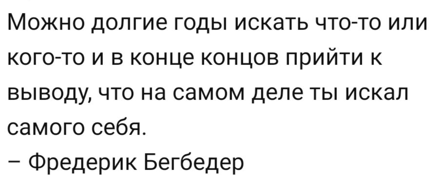 Всем привет! Немного подзатянул с новой порцией крылатых фраз. Однако, начнём. Сегодня о понимании себя, своём месте, своей миссии. Вот как тонко подмечено, ведь в реальности, все наши поиски сводятся к одному, к пониманию себя... У кого-то это понимание приходит достаточно быстро, у кого то вовсе не приходит, и тогда он начинает/продолжает угнетать свое окружение... Оглянувшись, каждый из нас может увидеть пару тройку примеров таких "затянувшихся искателей"... Есть такая игра, называется глухой телефон. Принцип следующий, цепочка из нескольких человек, передаёт некое послание от первого к последующем, все остальные не слышат о чем речь. Меня наверняка поправят специалисты, но, на пятом человеке, первоначальный смысл текста утрачивается полностью. Вот почему, на мой взгляд, приведённая выше цитата очень важна... Невероятное количество неверно истолкованных текстов приводят ко многим недоразуманиям... Этим высказывание очень хочется поделиться) ведь правда же, объем работы в обоих сл