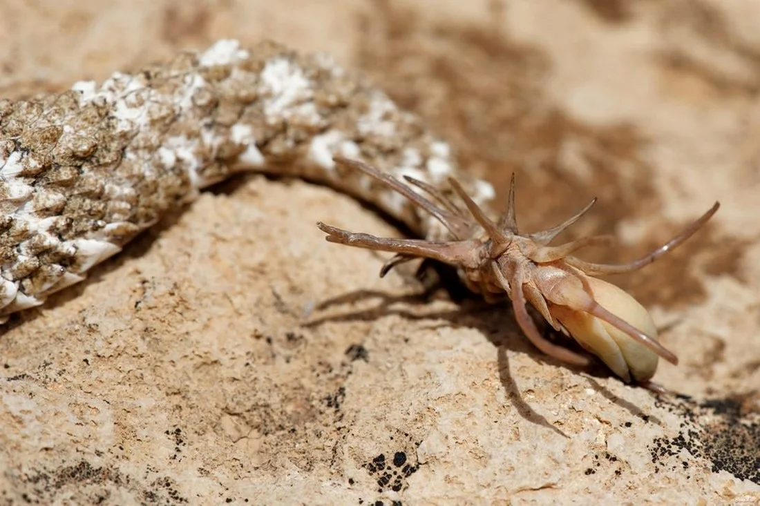 Это существо является новым для науки, описано только в 2006 году. Название – паукохвостая гадюка (Pseudocerastes urarachnoides). Первая паукохвостая гадюка была поймана в пустынях западной части Ирана в 1968 году и отправлена позже в музей естественной истории в Чикаго. Первым изучил ее в 1970 году биолог Стивен Андерсон, который сначала подумал, что маленький верблюжий паук зацепился за животное. При ближайшем рассмотрении он понял, что "паук" был на самом деле частью хвоста. Было ли это опухолью, рост которой был вызван некоторыми паразитами, или же генетическая деформация, или естественная часть животного? Имея всего лишь один образец, нельзя было сказать. "Таким образом, образец отложили, но не забыли, он хранился в течение почти четырех десятилетий", - пишет команда Андерсона. После этого в 2003 году иранский ученый Хамид Бостанчи нашел вторую гадюку с точно таким же хвостом. Оказалось, это не опухоль. Животное на самом деле так выглядит. Другой иранский ученый Бехзад Фатхинь