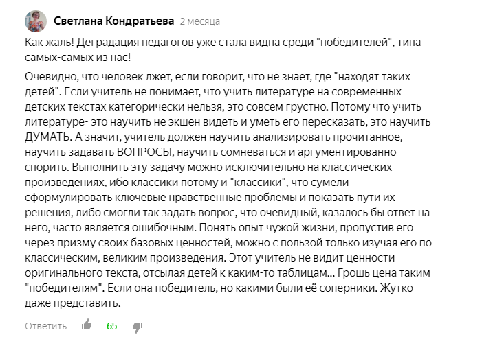 Дзен подбросил мне в рекомендации статью с многообещающим заголовком "Почему Лариса Арачашвили стала учителем года?". Статья как статья, а вот комментарии - отдельный извращенный вид удовольствия. "Война и мир", о которой я писала здесь, вдруг выступает в роли мерила умственного развития и успешности вашей диванно-ленивой деградации. Саму статью можно прочитать по ссылке или ознакомиться с тезисами ниже: У Ларисы Арачашвили все дети читают. Она удивлена тому, что где-то кто-то когда-то нашел нечитающих детей. Она поставила на полку для чтения в классе "Куриный бульон для души". Признаться, от сваренного бульона толку было бы больше. (прим.автора) "Войну и мир" лучше изучать в таблицах, потому что "это очень облегчает задачу". Изучение "Войны и мира" - сложная задача для учеников и учителей. Как вы догадались, для возмущения в комментариях нашлось два повода: качество предлагаемого чтения и святость и несокрушимость толстовской эпопеи. Давайте порассуждаем, почему же именно это произве