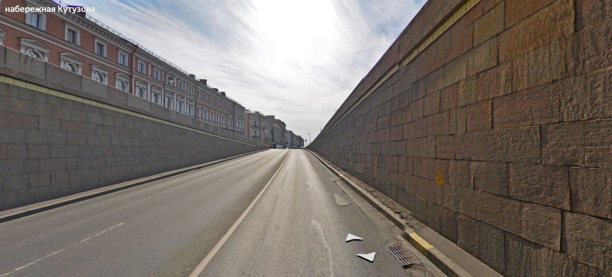А дело было следующим образом: ехал я по Воскресенской набережной в Петербурге, проезжал тоннель под Литейным мостом и должен был выехать на набережную Кутузова. Вот так выглядит это место - здесь ровно один ряд. Но вечером, когда скапливается пробка, особо одарённые водители начинает щемиться справа и выталкивать тех, кто едет по правилам.