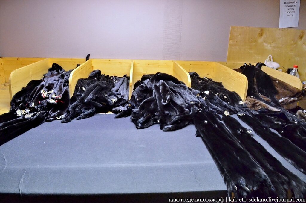 Все начинается с закупки меха, который поступает на фабрику из известных узким специалистам пушных аукционов, таких как: Копенгагенский пушной центр, Союзпушнина и аукцион American Legend. После того, как мех пришел на фабрику, делают сортировку. Зачем спросите вы? На самом деле даже мех от одного животного, например норки (на фото) может различаться по оттенкам, он может быть зеленоватым, отдавать синевой и т.д. Потому для каждой отдельной шубы выбирается нужное количество шкурок, которое варьируется в зависимости от фасона и размера изделия. В таком виде шкурка пушного зверька поступает на склад фабрики. Выглядит как чулок. После сортировки шкурка попадает в руки скорняку, который аккуратно разрезает ее, и делает надрезы в местах изгибов тушки, чтобы шкурка стала плоской. Затем каждый набор шкурок увлажняется специальным жировым раствором, чтобы они стали более эластичными. И закрепляются на таком столе степлером. Затем шкурки сохнут два дня, прежде чем начнется следующий этап, приб