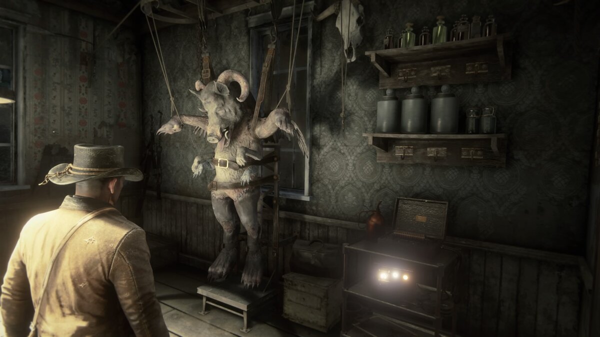 В доме, неподалёку от поста Ван Хорна, вы можете увидеть до жути странное и страшное существо. Бараньи рога, голова свиньи, гусиные крылья. Если очень долго рассматривать эту тварь, может стать слегка не по себе. Слава создателю, что человеку, сотворившему это, не удалось оживить эту тварь.
