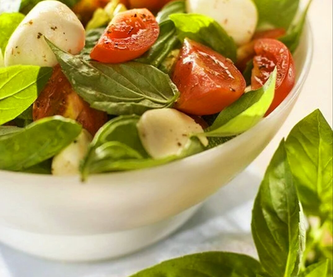 Cалат из помидоров, моцареллы и базилика с горчичной заправкой