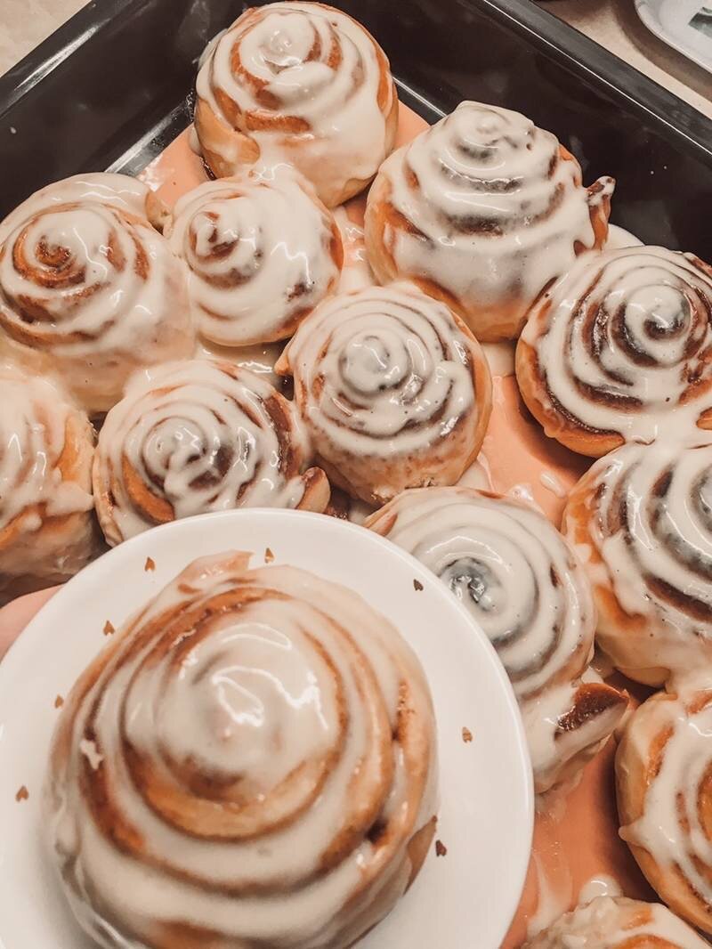 Для теста: ▫️600 г муки ▫️500 мл молока ▫️120 г растопленного сливочного масла ▫️1 ч.л. разрыхлителя ▫️100 г сахара ▫️2 ч.л. соли ▫️1 пакетик сухих дрожжей Для начинки: ▫️180 г масла ▫️170 г сахара ▫️2 ст.л. корицы Для крема: ▫️150 г сахарной пудры ▫️50 г творожного сыра ▫️З ст.л. (50г) растопленного сливочного масла ▫️1 ч.л. ванилина Что делать? ▫️ В большой миске смешать сахар, тёплое молоко, растопленное масло, дрожжи и 500 г муки. ▫️Накрыть полотенцем и оставить на час в тёплом месте. ▫️Добавить ещё 100 г муки, разрыхлитель и соль. ▫️Присыпать стол мукой и обвалять тесто до тех пор, как оно перестанет липнуть к рукам. ▫️ Раскатать прямоугольник из толщиной 1 см. ▫️Обмазать тесто растопленным маслом и присыпки смесью из коричневого сахара и корицы. ▫️Свернуть в тугой рулет и нарезать кусочками ~3 см. ▫️Выложить булочки на противень с пергаментом. Важно❗️Не кладите булки рядом друг с другом, при выпекании они увеличатся в размере. ▫️Накройте противень с булочка