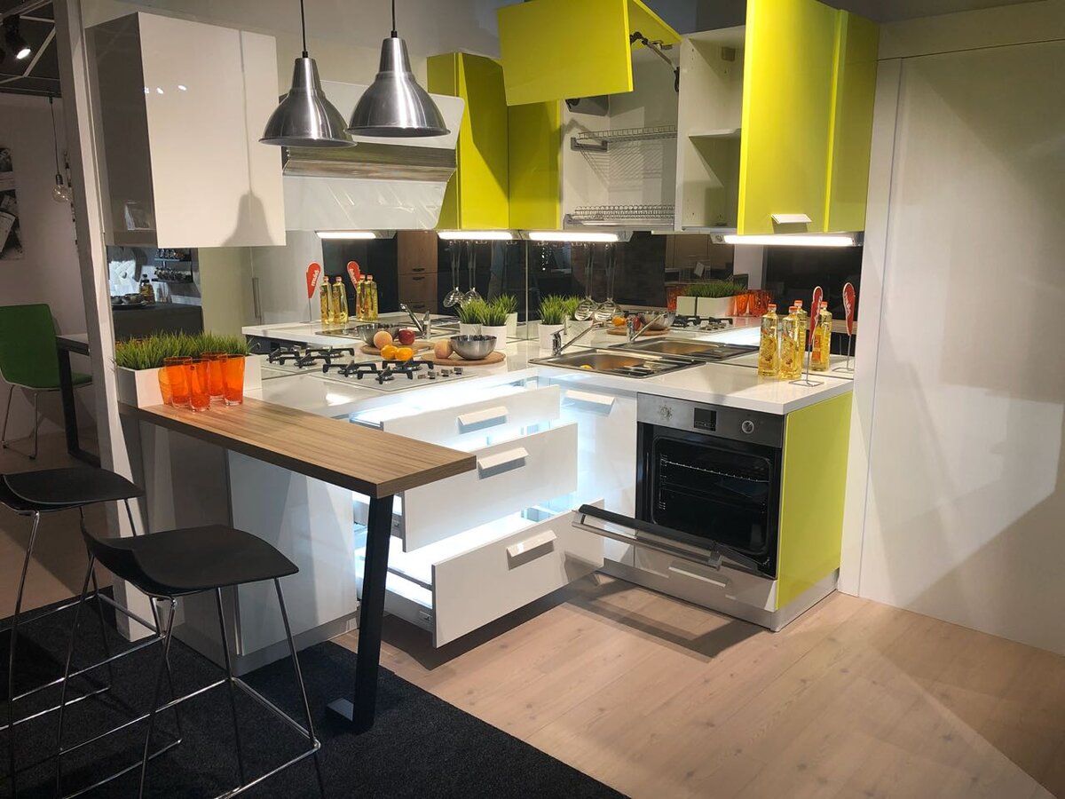 Крупные кухонные приборы, как например СВЧ печь, комбайн, кофе машина не размещайте на столешнице, рабочего пространства итак мало, зачем его занимать, разместите на отдельной полке или внутри кухонного предмета. Актуально для маленькой кухни, выбрать мульти функциональные приборы как например духовой шкаф с функцией свч и пр. Откажитесь от крупно форматной техники: отдельно стоящая газовая плита, полно размерная варочная поверхность или духовой шкаф. На рынке представлена компактная кухонная техника, например варочные поверхности на две и три конфорки, редко мы используем более двух одновременно, как правило мы используем варочную поверхность для хранения кастрюль, обратите внимание и на другие компактные приборы.