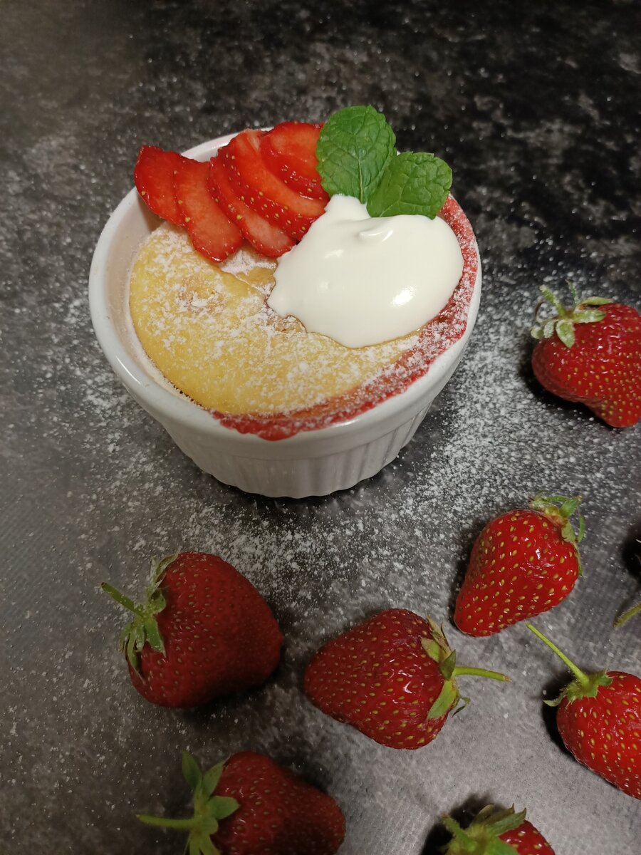 Люблю вот такие десерты, которые готовятся за 10 мин. (Не считая выпечки). Возиться не надо, раз-два и готово☺️. Я не планировала что-то готовить, но когда есть 🍓, просто грех не воспользоваться)). Это Клафути с клубникой, получается очень ароматным как клубнично-ванильное мороженое. После выпечки, по текстуре, тесто выходит достаточно плотное что-то между пирогом и запеканкой. Подается ещё теплым, со свежей клубникой и шариком мороженого, у меня не было мороженого я взбила просто сливки, вышло тоже 👌. *** Ингредиенты: Клубника 4-5 шт. Яйца 2 шт Сахар 2 ст.л Мука 80 г Сметана 100 г Разрыхлитель 1 ч.л Ванилин 0.5 ч.л *** Приготовление: Формочки смазываем сливочным маслом, на дно нарезаем клубнику пластинами. Смешиваем венчиком яйца с сахаром, добавляем сметану, перемешиваем. Вводим муку с разрыхлителем, ванилин. Замешиваем тесто. Тесто выходит редкое, это нормально, в процессе выпечки оно хорошо поднимается, но когда будет остывать опуститься. Это свойственно Клафути. Выпекаем при 180