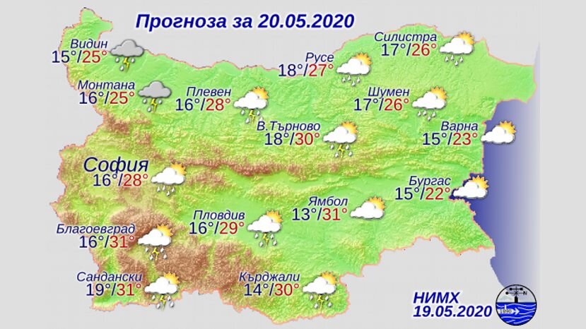 Ночью будет облачно, в Западной Болгарии с дождем. Днем с запада облачность начнет уменьшаться. После обеда над западной половиной страны облачность вновь начнет увеличиваться и на многих местах пройдут дожди. Максимальная температура будет между 25° и 30°... Прогноз погоды в Болгарии на 20 мая