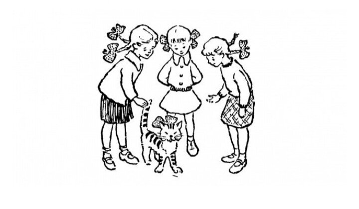 На рисунке три подружки :Ира Таня и Галя.С ними кот Мурзик .Только вот чей он?Кто хозяйка кота? Ответ. Мурзик принадлежит Гале-девочке с одним бантом .Второй она отдала Мурзику.