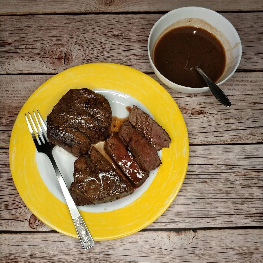 -Демигляс (соус - концентрированный мясной бульон) Зачистить вырезку от пленок и жира. Нарезать стейки шириной 5-6 см. из средней части вырезки. Мясо посолить, поперчить, обмазать небольшим количеством растительного масла. Оставить мариноваться минут на 20. Жарить стейки на хорошо разогретой сковороде периодически переворачивая минут 5. Добавить в сковороду ложку сливочного масла, пару раздавленных зубчиков чеснока и ветку розмарина (не обязательно). Обжаривать в этой смеси еще минут 5-7. Обжаренные стейки убрать в духовку на решетку, еще минут на 5-7 при 200 градусах. Соус: Из сковороды от стейков убрать чеснок и розмарин и влить 100-150 гр. вина, немного выпарить. Добавить в него ст.л. демигляса, растворить его. Снять с плиты и добавить ст.л. сливочного масла, постоянно помешивая, чтобы вбить в соус до полного растворения. #рецепт #филеминьон #говядина #вырезка #стейк