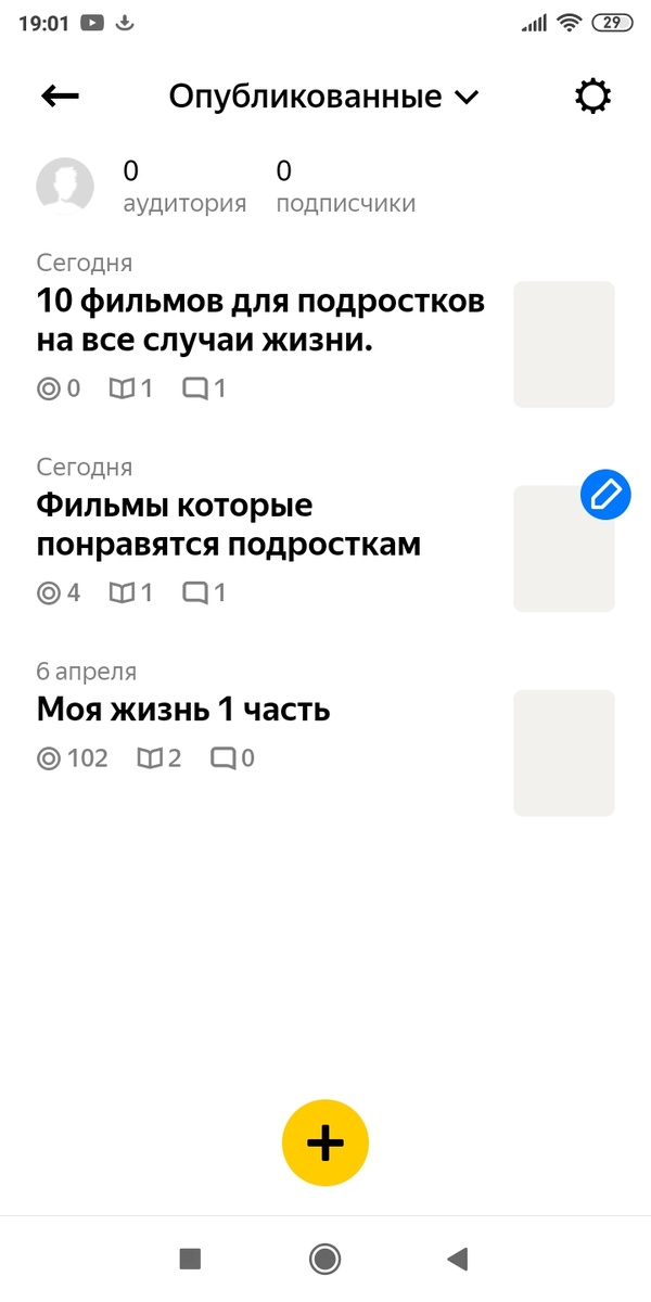Всем привет я обычный студент из Подмосковья в поисках дохода хотя бы не большого я наткнулся на это приложения подписывайтесь будет интересно каждый день я буду выкладывать отчёты по заработку с этого приложения Мой первый день прошёл конечно без дохода но самое главно не задаваться за сегодня я написал 2 статьи про кино для подростков И пока что ни каких плодов но всё со временем я планирую пробовать себя в написании разных статей не только кино возможно спорт, книги, просто мой маленький блок чем я занимаюсь дома и я считаю что в скором времени это будет мой посивный доход Подписываемся потому что только вы можете доказать то что можно заработать ставьте лайки и коментируй к я отношусь к критике очень хорошо с помощью вас мои статьи будут интересней