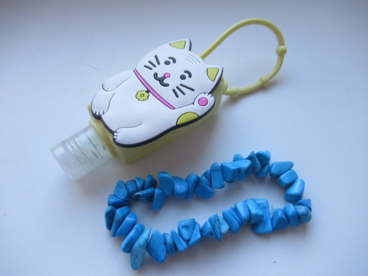 Бирюзовый браслетик за 99 руб, ну люблю я бирюзу. Кстати, там еще аметистовый остался, но я его только в июне смогу купить... И прикольный санитайзер для рук за 68 руб. Вот такой с кошечкой, петелькой для крепления и яблочным запахом...