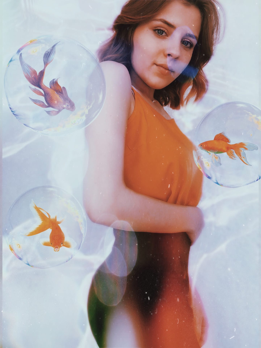 Интересная фотография, которую я обрабатывала 5 минут. Обрабатывала как всегда в PicsArt, потому что там нам представлен очень большой выбор стикеров. Я выбрала золотых рыбок, они подходят по цветовому сочетанию к моей одежде, только добавляйте на фото сначала рыбок, а потом уже на рыбок добавьте пузыри. Так же не забываем о о фильтрах и масках, чтоб фотка была более интересной. Вот простых 4 шага, которые не займут у вас много времени, фотография станет намного интересней и ее точно заметят в социальных сетях.