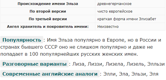 Женское имя Эльза имеет еврейское или древнегерманское происхождение. Возможно, действительно возникло в Германии, поскольку именно там пользуется наибольшей популярностью. По иной версии, вообще может являться краткой формой известного имени Элизабет, производной формы имени Елизавета, являющегося исконно русским. Среди русскоязычного населения не пользуется особой популярностью. Обладает невероятно сильной и уникальной энергетикой. Все Эльзы – это необычные и немного странные дамы, в которых сочетаются совершенно противоположные характеристики. Они одновременно честные и хитрые, серьезные и легкомысленные, уступчивые, но упрямые.