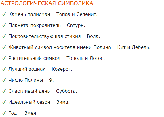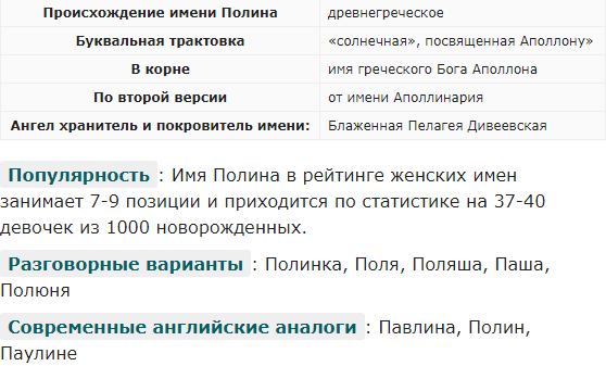 Женское имя Полина имеет древнегреческое происхождение. Могло быть создано в честь Бога древних греков по имени Аполлон. Имеет трактовку «посвященная Аполлону» или «солнечная». В ином варианте могло стать производным от имени Аполлинария с трактовкой «освобожденная». Пользуется популярностью во всех русскоязычных странах. В характере носительниц имени присутствует множество разных характеристик, но главной из них является коммуникабельность, поскольку вся их жизнь строится на общении. Как правило, Полина – это очень общительная и умная, дружелюбная и всесторонне развитая, утонченная и женственная, изысканная и привлекательная дама. СМОТРИТЕ ВИДЕО - ПОДРОБНЕЕ ТУТ Источник - Значение имени Полина: карма, характер и судьба