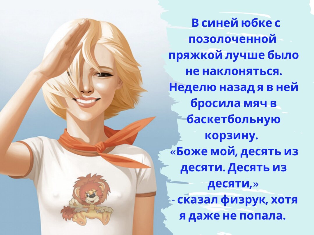 — Валерьева, ну ты где? - Под окном ждали одноклассницы, значит уже без десяти восемь. К концу седьмого класса парадная пионерская форма трещала по швам. Возникшая из неоткуда грудь пыталась вырвать пуговку с корнем при каждом вздохе. В синей юбке с позолоченной пряжкой лучше было не наклоняться. Неделю назад я в ней бросила мяч в баскетбольную корзину. «Боже мой, десять из десяти. Десять из десяти,» - сказал физрук, хотя я даже не попала. Думаю, даже дедушка Ленин сказал бы про десять из десяти, и что всё было не зря, увидев свой профиль на пышущей здоровьем груди моей подруги Тани. Я металась по комнате с удвоенной энергией кота, застигнутого врасплох, одной рукой натягивая капроновые колготки, второй - разматывая шнур утюга. Пионерский галстук, выуженный из кармана, был больше похож на помидор. «Всё, уходим, надо ещё шпоры на ляжке написать,» - донеслось снизу. Я с досады треснула утюгом по галстуку-помидору. Запахло палёным. Галстук теперь ещё и зиял дырой