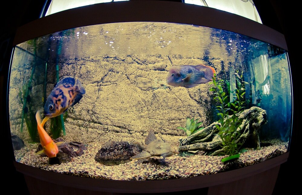 Так бы и остались жители нашего аквариума безызвестными рыбами, если бы к нам не приехал один хороший человек и не привёз с собой объектив fish-eye (рыбий глаз). Воспользовавшись этим обстоятельством, я устроил им такую фотосессию, какой наши безмолвные товарищи ещё не видели. Знакомьтесь: Психан. Формально глазчатый астронотус. Любит сухой корм и нервно бросаться на стенки аквариума. Долли. А вообще красный попугай. Сухому корму предпочитает мотыль и ничего его не тревожит. Рэйвер. Или анциструс обыкновенный. Миролюбивый сомик, который кушает то, что не съели остальные. Любит полежать на камешках и послушать неведомую нам музыку. Лобастый. Иначе бирюзовая акара. Нет гастрономических предпочтений, но любит задирать Психана. Ходят слухи, что погрыз свою подружку, которая от полученных травм скончалась. В общем, странная личность. Ребятам понравилась моя затея и все кроме Рэйвера с удовольствием мне позировали. Он предпочёл отлёживаться в сторонке. Есть ещё два ножа и маленький со