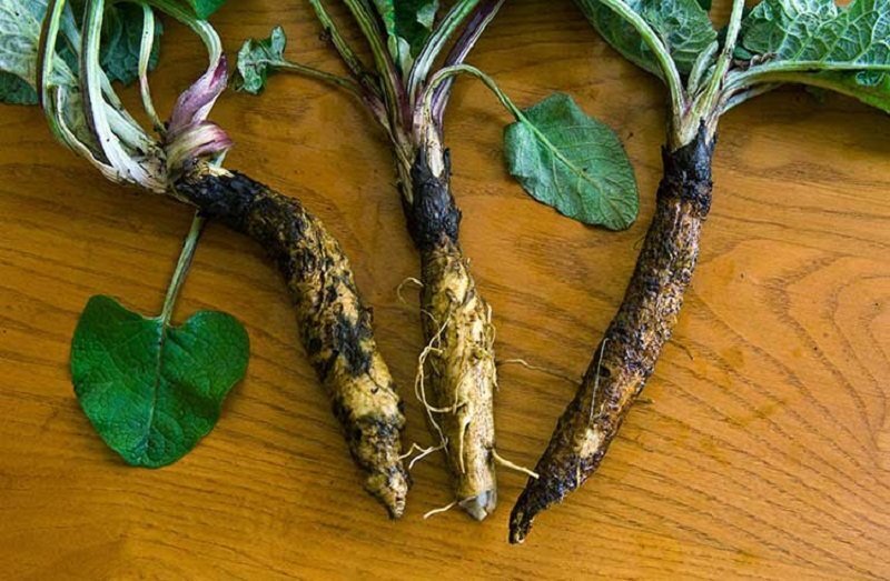 Корень лопуха и его польза В корнях лопуха содержатся до 45% полисахарида инулина, слизь, эфирные и дубильные масла, горькие и жироподобные вещества, смолы, протеин, большое количество витамина С, минеральные соли. Листочки лопуха содержат в себе эфирное масло, слизь, дубильные вещества, аскорбиновую кислоту. В плодах лопуха находится довольно много жиров (до 20%). Корни лопуха обладают мочегонным, желчегонным, потогонным и умеренно болеутоляющим свойствами. Корень лопуха способствует образованию ферментов поджелудочной железы, воздействует как лёгкое слабительное, улучшает состояние кожи. Помимо этого, он имеет антимикробные, антисептические и дезинфицирующие свойства, избавляет от зуда и от аллергических проявлений. Лопух обладает противовоспалительными, ранозаживляющими и противодиабетическими свойствами. Рецепты на основе лопуха Настой корней лопуха. Готовим настой таким образом: 10–25 граммов измельчённых корней заливаем двумя стаканами кипятка, настаиваем 1 час в термосе. Упот