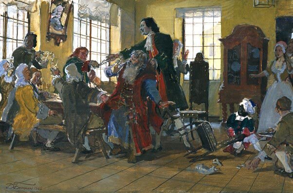 Пётр I предпочитал блюда российской кухни, а обеды с яствами европейской устраивал только для иностранных министров. Монарх отдавал преимущество простому и здоровому меню, обедал дома ровно в час и высмеивал гурманов, говоря, что тело с брюхом не принесет пользу отечеству. В повседневной жизни Пётр Великий не был гурманом, хотя мог себе позволить самые изысканные блюда. Для обеда государь выбирал обыкновенные щи, калорийные и наваристые каши. В праздничные и будние дни к столу иногда подавали поросёнка в сметане, которого император разделывал собственноручно. Из домашней птицы Петру I нравилась жареная утка. Для обеденного стола полезные яства готовил Ян Фельтен - любимый повар Петра Великого. Царские трапезы не обходились без студня, мясного заливного. Император не отказывался от ветчины, чесночной заправки, отварной говядины, квашеной капусты, жаркого с огурцами. Интересно, что Пётр I никакой рыбы. Объясняется это тем, что царь считал рыбу вредной для своего организма. Монарх высм