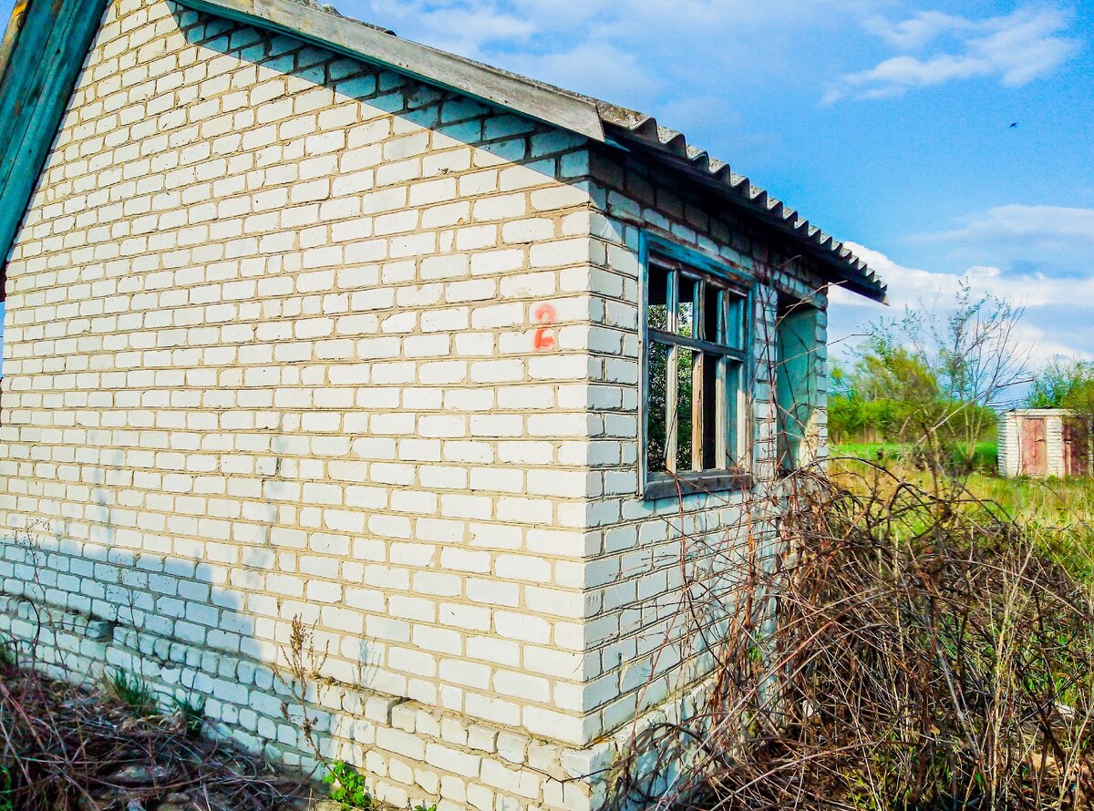 Мы продолжали идти по заброшенному дачному кооперативу. Заброшены были абсолютно все садовые участки. Раньше здесь люди трудились, сажали овощи, ухаживали за ними, собирали урожай. В одночасье все это стало никому не нужно, и дачники массово побросали все своим участки. Многие садовые домики, что стояли на участке, были разграблены и разгромлены мародерами. Некоторые разобрали и растащили на стройматериалы. Но были и такие домики, которые еще пока не разобрали, и они стоят целые. Вот такой мы нашли на участке добротный садовый домик. Стены его были кирпичные и целые. И крыша сохранилась. Стекла на окнах, правда уже отсутствовали. Когда-то рядом с домиком был виноградник. Сейчас виноградные лозы беспорядочно сплелись и просто лежали на земле. У входа в садовый домик было небольшое крыльцо в виде навеса. А дверь его бла открыта настежь. Давайте попробуем зайти внутрь. Заходим внутрь и попадем в небольшую комнатку, как предбанник перед основным помещением дачного домика. В углу этой прист