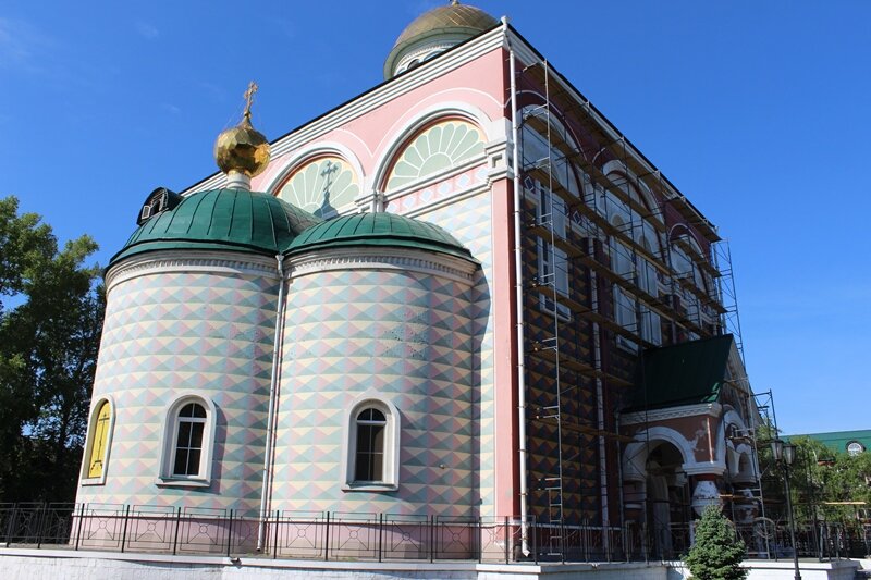 На фасаде Градо-Абаканского храма в честь святых равноапостольных Константина и Елены начались работы по обновлению росписи, выполненной в технике «шахмат». Уникальное храмовое сооружение давно стало архитектурной достопримечательностью Абакана: его цветная мозаика выполнена в стиле старорусского зодчества, например одного их храмов Троице-Сергиевой Лавры. Прошло 13 лет с момента, как храм был освящен в 2007 году, и возникла настоятельная потребность в обновлении росписи: необходимо придать яркость четырехцветной мозаике. Работы по обновлению росписи выполняет строительная организация ООО «Ремстрой» (директор Леонид Кораблев). Строители сохранили цветовую гамму в технике «шахмат»: это темно-зеленый, синий, желтый и пурпурный цвета. Работы по обновлению начались с северной стороны и продолжатся по всей окружности храма. Этот довольно сложный труд оплачивается из пожертвований прихожан. Информотдел