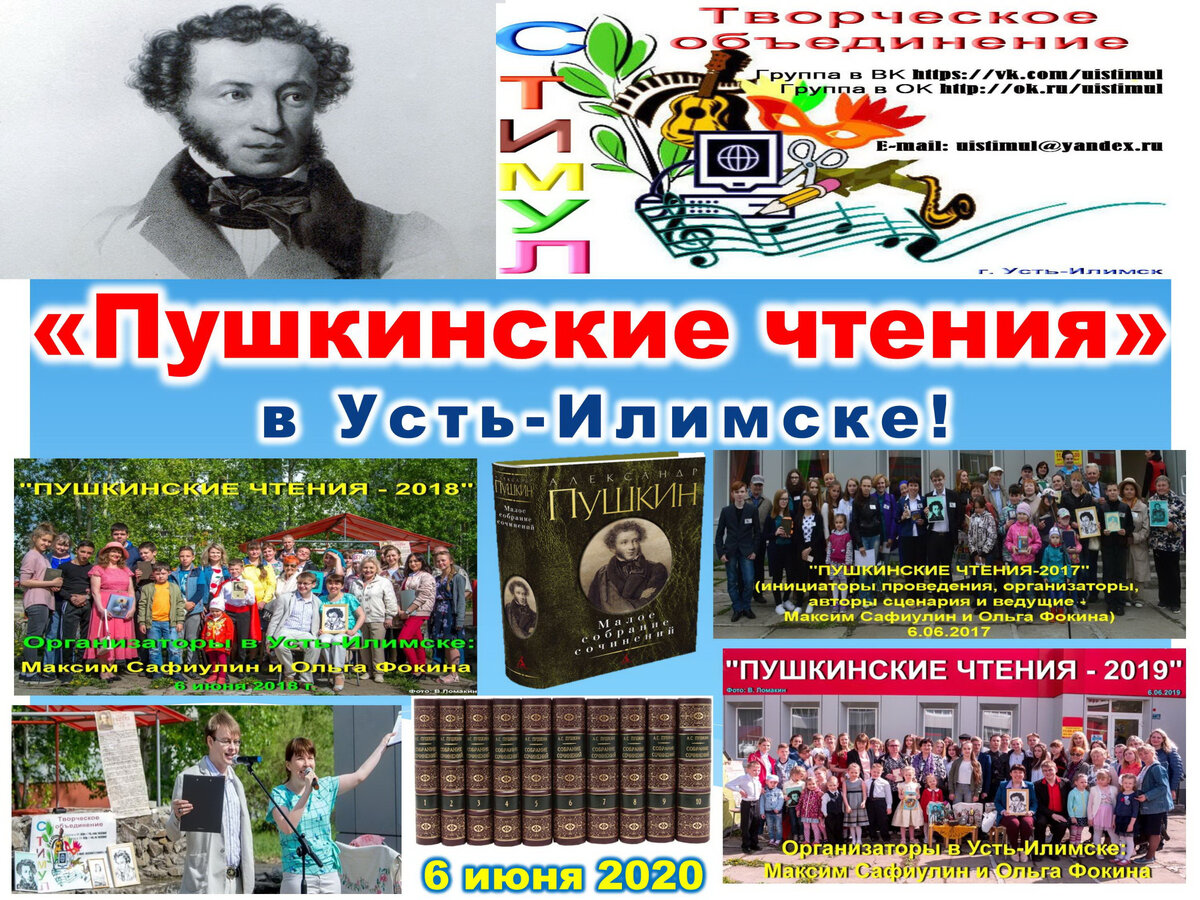Приглашаем всех желающих принять участие в ежегодной акции ТО «СТИМУЛ» «Пушкинские чтения в Усть-Илимске» В ДИСТАНЦИОННОМ ФОРМАТЕ (можно снимать дома). Записывайте ВИДЕО (индивидуальное, коллективное, семейное, взрослых, детей) с прочтением любого ПРОИЗВЕДЕНИЯ А.С. Пушкина (стихи, проза, сказки), с исполнением ПЕСНИ на стихи А.С. Пушкина, можно представить самые интересные фрагменты его БИОГРАФИИ (что-то очень редкое и необычное). В кадре - книги А.С. Пушкина и всё, что с ним связано, а также эмблема акции. Перед прочтением или исполнением обязательно сказать: «Я УЧАСТВУЮ В АКЦИИ ТВОРЧЕСКОГО ОБЪЕДИНЕНИЯ «СТИМУЛ» «Пушкинские чтения в Усть-Илимске». Отправляйте видео на электронный адрес uistimul@yandex.ru (в теме письма: «Пушкинские чтения») вместе с ЗАЯВКОЙ ДО 3 ИЮНЯ. КАЖДЫЙ участник акции и КАЖДЫЙ наставник гарантированно получат свои Благодарственные письма. Подробности внутри ссылки: https://proza.ru/2020/05/20/400 Организаторы: члены Международной гильдии писателей, орга