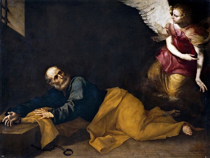«И вот, Ангел Господень предстал, и свет осиял темницу. Ангел, толкнув Петра в бок, пробудил его и сказал: встань скорее. И цепи упали с рук его. И сказал ему Ангел: опояшься и обуйся. Он сделал так. Потом говорит ему: надень одежду твою и иди за мною. Петр вышел и следовал за ним, не зная, что делаемое Ангелом было действительно, а думая, что видит видение».