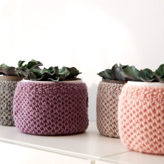 Grace Bonney предлагает выбрать для декорирования горшков самые простые узоры – платочную вязку, путанку или шахматку. Такое решение идеально подойдет для неопытных мастериц. Работы Grace Bonney