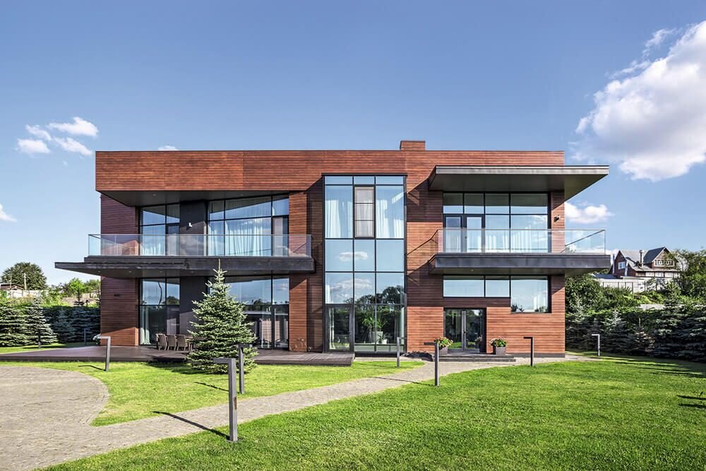 Автор проекта: архитектор Ольга Фрейман Супруги — самодостаточные, высокообразованные молодые люди, занимающиеся бизнесом, любящие большие шумные компании, но тем не менее считающие самым главным семью, традиционные ценности и надежные отношения, — видели свой дом похожим на себя: современным, амбициозным, отчасти минималистичным, но обязательно с классическими деталями. В одном из элитных подмосковных поселков заказчики приобрели участок, на котором уже стояла коробка дома. Его весомым преимуществом был открывающийся вид на Москву-реку, поэтому главную роль здесь предстояло сыграть панорамному остеклению. В этой связи требовалось грамотно спланировать и всю территорию. Чтобы обеспечить широкий обзор на реку, деревья и кустарники расположили преимущественно вдоль боковых границ участка, а чтобы соблюсти принцип минимализма, оставили много свободного пространства с газоном. Кроме того, построили хозблок с гаражом и помещением для персонала. Парадная зона первого этажа включает в