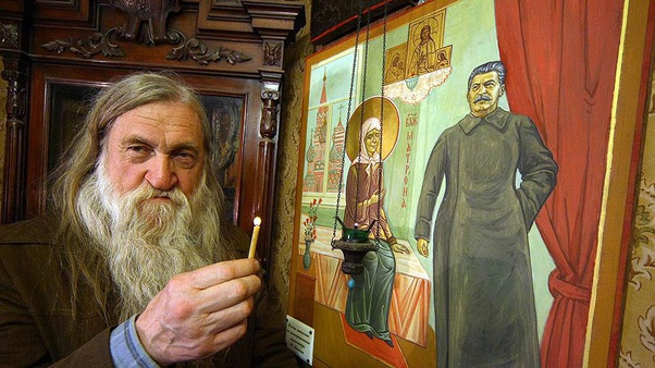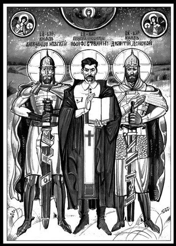В 2008 году в храме святой Ольги была размещена икона. На нем изображены Иосиф Сталин и блаженная Матрона Московская. Как гласит легенда, Сталин регулярно навещал ее, чтобы спросить ее совета о том, как защитить Москву от фашистов во время Второй мировой войны. Отец Евстафийский из св. Ольги считает Сталина одним из отцов России «как бы он ни был плох». Может ли Иосиф Сталин стать святым? В 2008 году Коммунистическая партия в Санкт-Петербурге обратилась с петицией к Православной церкви с просьбой канонизировать Иосифа Сталина, если он победит в опросе "Имя России", проводимом каналом "Россия". Сергей Малинкович сказал, что «к концу XXI века иконы святого Иосифа Сталина будут в каждой православной церкви» Это, конечно, никогда не происходило. Я также нашел это произведение: На нем изображен Сталин, предположительно держащий Библию. Слева от него - Святой Александр Невский, а справа - Дмитрий Донской, который, как полагают, первым победил турок из Золотой Орды.