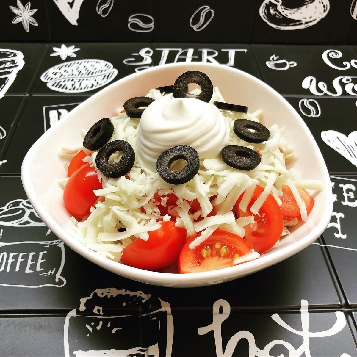 Заправляем майонезом. Сверху можно украсить маслинами.