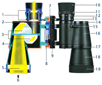 Основные элементы конструкции бинокля: 1. Линзы окуляров 2. Окулярный конус 3. Призмы 4. Антиотбивающий конус 5. Линзы объектива 6. Свет 7. Крышечка верхнего шарнира 8. Центральное колесо фокусировки 9. Крышечка нижнего шарниру (и гнездо штатива) 10. Резиновая глазная чаша 11. Диоптрийне кольцо 12. Индикатор диоптрийной настройки 13. Мост 14. Верхняя корпусная крышка 15. Крепление нашейного пояса 16. Нижняя корпусная крышка 17. Объективная бочечка 18. Крышки объектива Классификации биноклей По своим габаритам бинокли классифицируются на компактные (с фиксированной и переменной кратностью) и классические (с фиксированной и переменной кратностью). Компактные бинокли, как можно судить уже по самому названию, намного меньше по весу и габаритам, чем классические. Они, как правило, рекомендуются для использования охотниками и туристами. Зато классические могут подойти для самых разных целей: охота, рыбалка, наблюдение за птицами, дикими животными, спортивными соревнованиями. По способу фокус