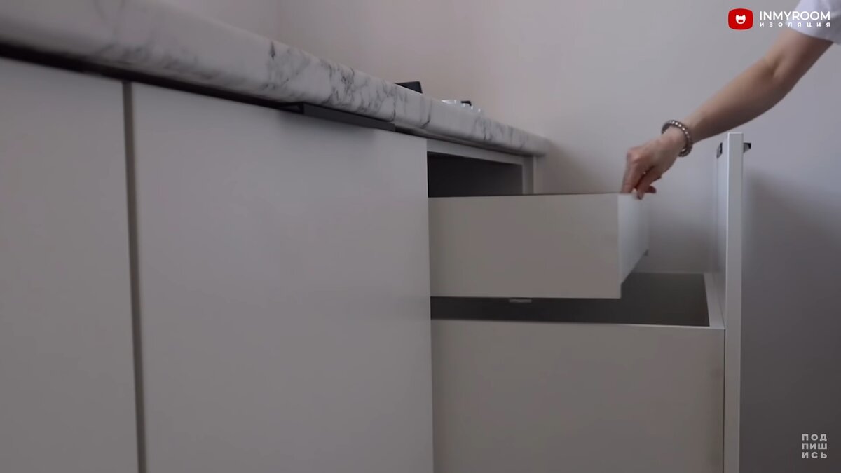 Все чаще в кухнях стали использовать скрытое хранение. Это очень удобно и эстетично. Посмотрите, как организован скрытый ящик для приборов в минималистичном интерьере этой кухни.