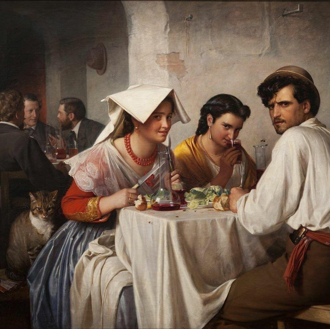 Трапеза молодой итальянской компании внезапно прерывается. Художник ловит на себе осуждающие взгляды кота и юноши, на фоне которых нагло летают мухи и прочие осы. Девушки же смотрят с любопытством и даже с некоторым кокетством на Блоха, запечатлевающего всё это действо. Вот-вот и юноша, кажется, сейчас накинется на автора, достав свой нож, что у него в кармане. Но всё тщетно, ибо художник сам присутствует на картине и сидит к нам спиной на заднем плане.