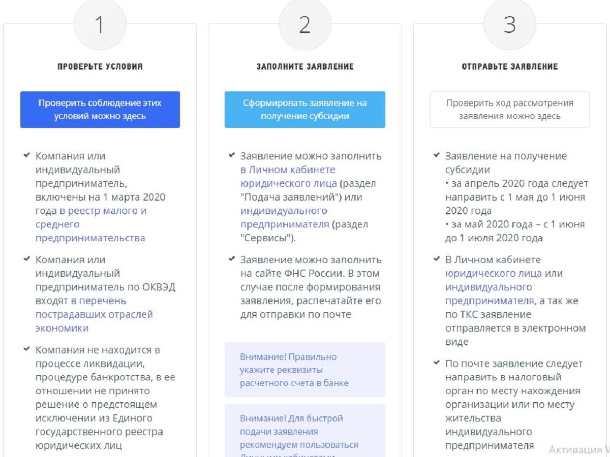 В мае начал работу онлайн-сервис ФНС, который позволяет получить субсидии малому и среднему бизнесу, пострадавшему из-за пандемии COVID-19 и карантина. Кто может получить субсидии за апрель-май текущего года на зарплаты работникам? ⚠ Предприятия, которые относятся к отраслям из официального списка наиболее пострадавших. Проверить по ИНН можно тут. На сайте налоговой размещена инструкция, в которой разъяснено, как получить субсидию. С помощью сервиса можно отслеживать статус рассмотрения заявки. ⚠ Срок ожидания — не более 3 дней. От чего зависит величина субсидии? Размер субсидии зависит от численности работников и организационно-правовой формы. Формула для организаций: ✔ МРОТ*число работников. Для ИП: ✔ МРОТ*(количество работников + 1). ИП-одиночки: ✔ 1 МРОТ (примерно 12 тыс. рублей). Условия выделения субсидии Основные требования: Ждать выплаты в случае положительного решения ФНС можно с 18 числа месяца, последующего за месяцем оформления субсидии. Бесплатная консультация по телефон