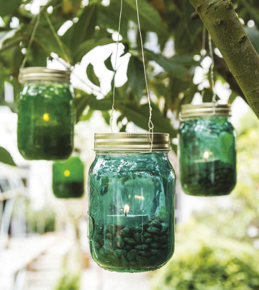 Теплая погода манит всех на свежий воздух. Хочется удобно расположиться на участке или балконе, предварительно завернувшись в плед и приготовив чашечку ароматного чая. Поэтому пришло время позаботиться о мелочах, придающих вечеру ауру сказки и запоминающихся моментов. Самым важным предметом интерьера балкона или внутреннего дворика будет являться освещение. Романтическим натурам чужды электрические светильники. С ними трудно расслабиться и смотреть на звезды. Так что придется задуматься о живом огне. Костер разжечь проблематично в крохотном дворике, а на балконе вообще невозможно, да еще есть риск пропахнуть дымом. Можно держать наготове специальные фонари, но вдруг их не окажется под рукой, а посидеть на свежем воздухе хочется уже сейчас. На этот случай есть простое и недорогое решение. Украсить свою территорию для отдыха можно с помощью обычных стеклянных банок, крупы и веревки или проволоки. Чистую и сухую банку небольшого размера (можно взять из цветного стекла) наполните крупой