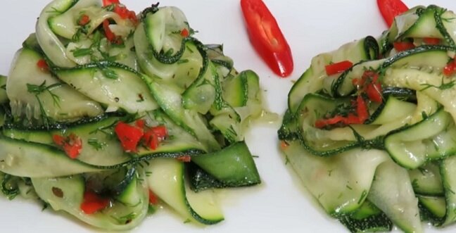 Вкусные маринованные кабачки получаются очень хрустящими, сочными с ароматной заправкой, с чесноком и укропом. Это очень аппетитно, вкусно и полезно Ингредиенты: - цукини (кабачки) молодые 500 гр. - чеснок 4 зубчика - укроп 1 пучок - перец чили 1 шт. по желанию - рисовый уксус 2 ст. л. - мёд 1,5 ст. л. - оливковое масло/растительное масло 4 ст. л. - сушеный орегано ½ ч. л. - соль, перец Способ приготовления: 1. Ножом для овощей, нарезаем цукини тонкими полосками. Можно использовать обычный кабачок. Так как цукини у меня совсем молодой я его не очищала. Если кабачок большой и идут крупные семечки, можно не нарезать их, просто переворачиваете цукини и нарезаете с другой стороны. 2. Цукини слегка солим, осторожно перемешиваем и оставляем минут на 20, чтобы они отдали сок. 3. Подготавливаем заправку. Очищаем чеснок, раздавливаем его, мелко нарезаем и отправляем в глубокую миску. 4. Растираем между ладонями перец чили, срезаем верхушку и стучим по перцу , что бы все семена высыпались. Ра