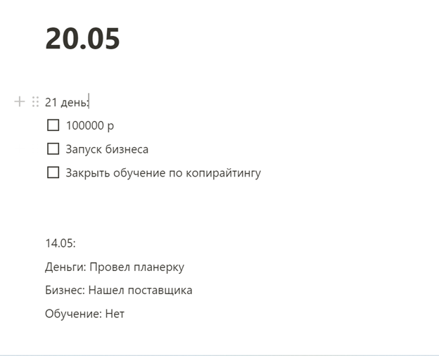 Ох как же я разленился за этот карантин. Через 2 недели после объявления еле-еле вставал с кровати, брел до холодильника, съедал половину его содержимого и возвращался опять на кровать. Под конец середины дня я все-таки добирался до ноутбука, чтобы поработать. Но моя вялость не позволяла мне быть максимально продуктивным. И тут я задумался. Почему раньше было меньше времени, но при этом я был гораздо трудоспособное и продуктивнее? И понял, что до карантина я занимался спортом, следил за питанием, придерживался режима дня. А тут разленился и всё пошло-поехало. Чтобы вернуть свое «рабочее» состояние я решил составить собственный чек-лист, который мотивировал бы меня не залеживаться в кровати. Для составления чек-листа я использовать первый попавшийся сайт по планированию. Записал 3 цели на 21 день. Сколько хочу заработать, какой бизнес начать и какое обучение пройти. Все расписал и теперь каждый день я записываю какие шаги я предпринимаю для достижения цели. А так же на этом же файле за